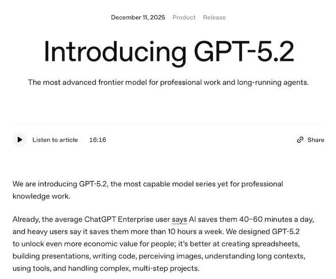 OpenAI推出GPT-5.2,加快迭代应对模型竞速