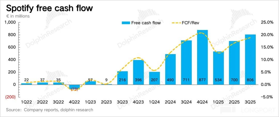 Spotify 2025 年三季报在 11 月 4 日美股盘前出炉,业绩表现好坏参半。但或许市场主要担忧点——利润率,实际超预期,从而带来了略偏积极的市场反 馈。 具体来看: 1. 利润率超预期改善:三季度以来,Spotify 做了不少产品改动(近 30 项大小功能更新),包括无损音质、播放列表编辑、发送消息、个性化音质设置, 以及与 ChatGPT、Netflix 的合作等,另外一个比较重要的改动就是对免费用户从 "随机播放" 改为 "可主动点播畅听 1h"。 目的是通过提高用户体验,来增加用户粘性,进而无形中提高付费转化。 考虑新功能的扎堆上线,市场对当期成本投入增加预期得比较充分。但实际来看,Q3 毛利率、经营利润率均有超预期的改善。其中经营费用大幅度收 缩,除了 Social charge 明显下降外(一般跟随员工福利波动,包括股权激励,三季度 Spotify 股价相比二季度末下降 10%),公司对营销推广、人员成本 都做了有力控制。 2. 收入指引仍然偏弱:但另一面,表现较差的还是收入端。管理层指引 Q4 收入 45 亿欧元,增速 9.8%,小幅低于市场预期的 11.5% 同比增速。 海豚君认为,预 ...