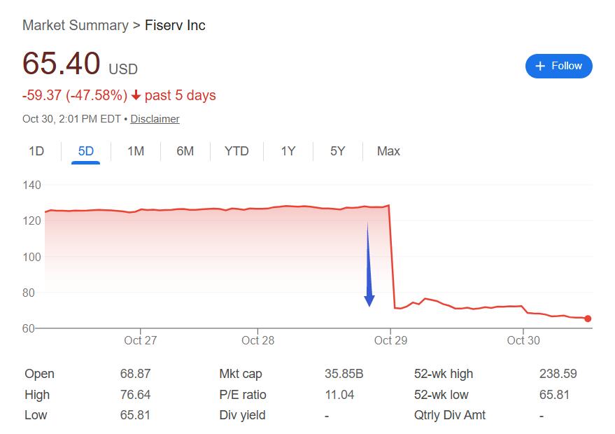 Fiserv股价一日暴跌44%,创上市近四十年最大跌幅。这一崩盘表面上看源于新任CEOs撤回此前业绩指引,但实质上暴露的是管理 失败:定价策略失误、过度承诺增长,以及对客户需求反应迟钝的企业文化。这带给投资者的警示是:即便数字经济中最根深蒂固的 公司,也可能因管理失误而轰然倒塌。 Fiserv的股价崩盘表面上看源于新任CEO Mike Lyons撤回此前业绩指引,但实质上暴露的是管理失败:定价策略失误、过度承诺增 长,以及对客户需求反应迟钝的企业文化。 今年1月加入Fiserv并于5月正式接任CEO的Lyons周三披露财报时宣布,将全年调整后每股收益(EPS)预期从10.15美元至10.30 美元下调至8.50 美元至8.60 美元,下调幅度超过16%。营收增长预期砍掉过半,从10%降至3.5%~4%。 本周三,美国金融科技行业遭遇了一场近年来最为震撼的"血案":金融科技巨头Fiserv股价暴跌约44%,创公司上市将近四十年来最 大单日跌幅,市值蒸发约300亿美元。 Fiserv的三季度业绩也远逊华尔街预期:营收同比仅增长约1%至49.2亿美元,较预期53.6亿美元低逾8%,调整后EPS为2.04美元, 较预 ...