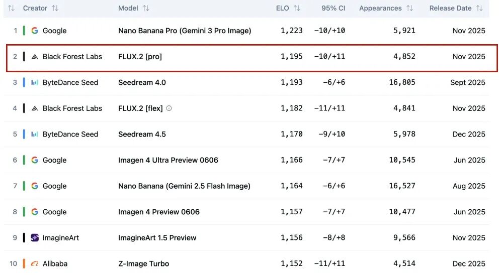 一家低调的德国AI初创公司,凭什么被誉为"AI生图界的DeepSeek"? 智东西12月15日报道,在Artificial Analysis的文生图榜单最新排名中,德国人工智能实验室Black Forest Labs的FLUX.2[pro]排名第二,仅次于 谷歌的Nano Banana Pro。轻量版FLUX.2[flex]则排名第四,在字节跳动Seedream 4.5之前。 | ﮨﮯ | Creator 1J | Model 14 | ELO 17 | 95% CI | Appearances îJ | Release Date 1+ | | --- | --- | --- | --- | --- | --- | --- | | 1 G Google | | Nano Banana Pro (Gemini 3 Pro Image) | 1,223 | -10/+10 | 5,921 | Nov 2025 | | 2 | & Black Forest Labs | FLUX.2 [pro] | 1,195 | -10/+11 | 4,852 | Nov 2025 | | ന | In ByteDance Se ...