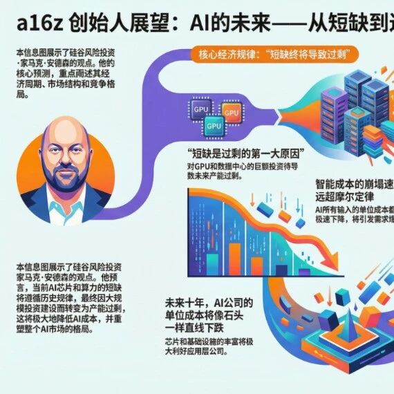 编辑 | 硬 AI 要点提炼: "如果有什么东西出现了短缺,人类的历史证明它最终会被大规模复制,直到变成过剩——AI芯片和算力也不会例外。"a16z联合创始人预言,AI是比互联网更宏大的技术变革,目前 尚处于早期阶段。他指出,智能成本正以超摩尔定律的速度崩塌,基础设施的短缺终将导致产能过剩,从而利好应用层。 作者 | 硬 AI 成本"通缩" : 智能的单位成本(Per unit cost)下降速度远超摩尔定律,这将带来需求的爆发性增长。 "短缺导致过剩" : 遵循"短缺导致过剩"的历史规律,GPU和数据中心的大规模建设最终将导致供应过剩,从而进一步压低AI成本。 市场结构 : 未来AI市场将类似计算机产业结构:少数"上帝级模型"(类似超级计算机)在顶端,海量低成本"小模型"在边缘侧普及。 中美竞争 : 这是一个双雄争霸的局面。中国(如DeepSeek、Kimi)在追赶速度、开源策略和芯片自研上表现惊人,这促使美国联邦层面的监管风向转为支持创 新。他说道,"基本上AI只在美国和中国被构建。世界其他地方要么造不出来,要么不想造"。 商业模式 : AI应用正从"按Token付费"向"基于价值定价"转移;初创公司不再 ...