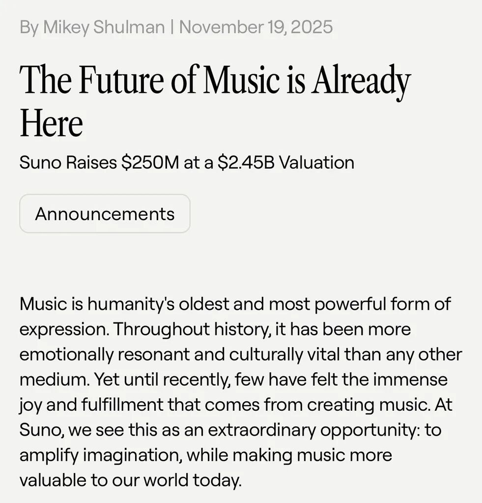 融资与估值 - 公司完成2.5亿美元C轮融资,由Menlo Ventures领投,NVentures、Hallwood Media、Lightspeed和Matrix等机构参与[1] - 此轮融资后公司估值达到24.5亿美元,较今年5月的5亿美元估值大幅增长[2] - Nvidia的风险投资部门NVentures参与本轮融资,显示出对生成式音频领域的强烈信心[9] 业务与产品发展 - 公司推出Suno Studio,将其定位为首个生成式音频工作站,融合多轨编辑与AI音轨创建功能,旨在为用户提供更多控制权、更清晰的混音和更高质量的人声[4] - 公司发布v5模型,是其最先进的模型,声称能提供更清晰的提示和更精确的结果[4] - 公司在推出Studio之前收购了首个基于浏览器的数字音频工作站WavTool,并将其技术整合至自身生态系统中,以构建更深层次的工作流程[5] - 新融资将用于推出更多专业工具,提升普通创作者的体验,扩展社交功能并支持更直观的协作[10] 用户与市场影响 - 公司声称拥有数百万用户,日活跃度很高,并认为这反映了人们在歌曲创作方式上发生了明显的文化转变[3] - 平台创作者涵盖从首次使用者到专业人士,用户使用场景包括尝试想法、制作完整曲目、与朋友分享歌曲以及作为艺术家发布作品[6] - 公司表示已有近1亿人使用其工具,视此为重要文化时刻的证据,并相信AI将改变人们对创造力的定义[11] 法律环境与行业前景 - 公司面临索尼、环球音乐集团和华纳音乐集团的诉讼,这些集团指控公司在未经同意的情况下抓取受版权保护的音乐进行训练,但公司对此予以否认[6] - 公司同时在丹麦面临Koda、在德国面临GEMA的挑战,表明围绕AI训练的法律问题尚未解决[7] - 风险投资机构认为公司反映了深刻的市场变化,相信数百万新创作者将进入音乐领域,AI将在此过程中扮演重要角色,并看好其全栈系统带来的先发优势[8] - 投资者将当前法律挑战视为短期阻力,并认为达成授权协议可能是最终结果,类似于流媒体早期的发展路径[7]