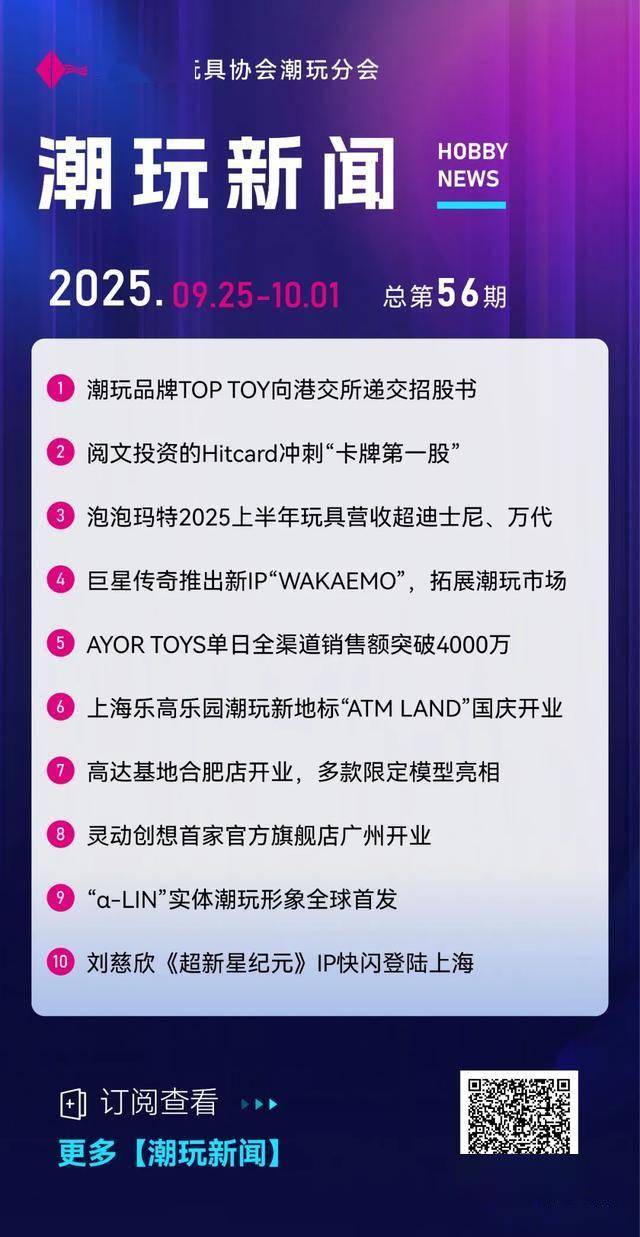 1. 潮玩品牌TOP TOY向港交所递交招股书 9月26日,名创优品旗下潮玩品牌TOP TOY向港交所递交招股书,摩根大通、瑞银集团、中信证券为 IPO的联席保荐人。TOP TOY称,募资的主要用途为丰富IP矩阵、深化全球市场全渠道布局、品牌营 销、提升数字化能力等。据招股书显示,TOP TOY是中国规模最大、增速最快的潮玩集合品牌。2024 年公司GMV(商品交易总额)24亿元。【】 新兴潮玩品牌AYOR TOYS自9月25日官宣田栩宁为代言人后,首日全渠道销售额即突破4000万,强势 登顶天猫、抖音、小红书行业榜单TOP1。此次热销核心得益于"明星+IP"策略,旗下原创IP"兔闪闪 ShyShy"系列借势明星效应持续发力。此外,成立仅三月的AYOR TOYS已获阿里巴巴领投。 6. 上海乐高乐园潮玩新地标"ATM LAND"国庆开业 2. 阅文投资的Hitcard冲刺"卡牌第一股" 阅文集团参投的卡牌品牌Hitcard正推进上市进程,剑指"卡牌第一股"。 Hitcard是上海骑形网络科技有 限公司旗下品牌,聚焦潮玩IP卡牌品牌,专注于成年人收藏卡片,获泡泡玛特、红杉中国等多方投资, 阅文集团持股10%并深 ...