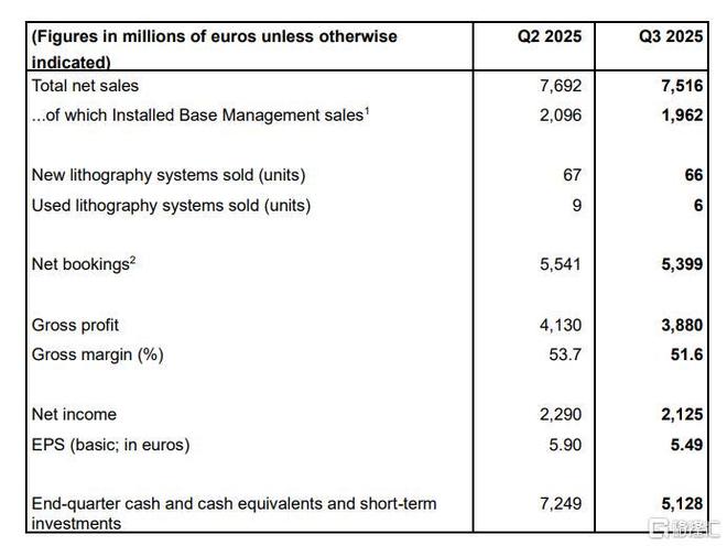 以下文章来源于锦缎研究院 ,作者耀华 锦缎研究院 . 专注上市公司价值发现与传播 将投中网设为"星标⭐",第一时间收获最新推送 AI存储需求是关键支撑。 北京时间10月 1 5 日午后,荷兰光刻机之王阿斯麦( ASML ) 披露了第三季度财报,营业收入录 得 75.16 亿欧元,处于二季度指引的低位区间,略低于行业一致性预期,差距不大。每股收益 5.49 欧元,略高于预期的 5.33 欧元,主要得益于费用略低于指引的区间。 | 图: | | --- | ASML 财报汇总,来源:企业财报,锦缎研究院整理。点击可看大图 整体来看财报表现中规中矩,如果以行业惯性 ArFi 产品(浸润式光刻机,DUV系列)24 个月和 EUV18 个月的交付周期来看,三季度正好处于 23Q3 和 24Q1 的预定周期内,而 23Q4 和 24Q2 相对业绩高点需要下个季度兑现。 管理层指引较二季度相对乐观,预计四季度营收 92 亿至 98 亿欧元之间,毛利率在 51%-53% 之 间,全年整体增速维持在 15% 。 在二季度主动调低指引后(一季度指引上限全年增速约为 24% ),三季度维持了二季度的全年展 望,同时管理层透露了好坏 ...