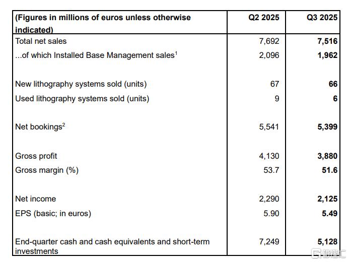 如果您希望可以时常见面,欢迎标星收藏哦~ 当地时间10月15日,全球光刻设备巨头ASML在荷兰费尔德霍芬发布了2025年第三季度财报。 财报显示,公司第三季度实现净销售额75亿欧元,净利润21亿欧元,毛利率为51.6%,整体表现符 合此前预期。更值得关注的是,本季度新增订单金额达到54亿欧元,其中EUV(极紫外光刻)订单高 达36亿欧元,占比超过三分之二,充分反映出全球半导体制造商对先进制程光刻设备的旺盛需 求。 | Q3 2025 | | | --- | --- | | Total net sales | €7.5 billion | | Net system sales | €5.6 billion | | Installed Base Management1 sales | €2.0 billion | | Gross Margin | 51.6% | | Operating margin2 | 32.8% | | Net income as a percentage of total net sales | 28.3% | | Earnings per share (basic) | €5.49 | ...