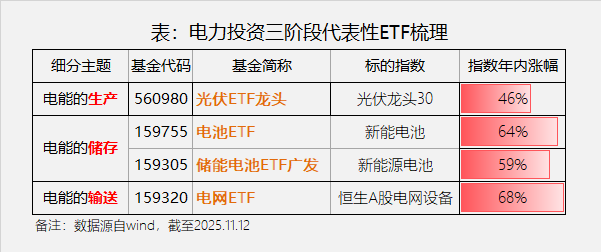 11月13日,锂电产业链全线走强,其中电解液方向表现尤为突出,宁德时代早盘涨超8%,华盛锂电等 多股涨停。行业数据显示,电解液材料价格普遍上扬,六氟磷酸锂、VC添加剂等因供需格局偏紧,价 格出现显著波动。 | | | 衣,电力以贝_阶段(衣工厂)防生 | | | | --- | --- | --- | --- | --- | | 细分主题 | 真金代码 | 基金简称 | 标的指数 | 指数年内涨幅 | | 电能的生产 | 560980 光伏ETF龙头 | | 光伏龙头30 | 46% | | 电能的储存 | 159755 电池ETF | | 新能电池 | 64% | | | 159305 储能电池ETF广发 | | 新能源电池 | 59% | | 电能的输送 | 159320 电网ETF | | 恒生A股电网设备 | 68% | | 各注· 数据语自wind 武至2025 11 12 | | | | | ETF市场方面,与锂电产业相关的主题品种涨幅居前。全市场同类规模最大的电池ETF(159755)早盘 涨逾7%,半日成交额超13亿元;储能电池ETF广发(159305)涨近5%,光伏ETF龙头(560980) ...