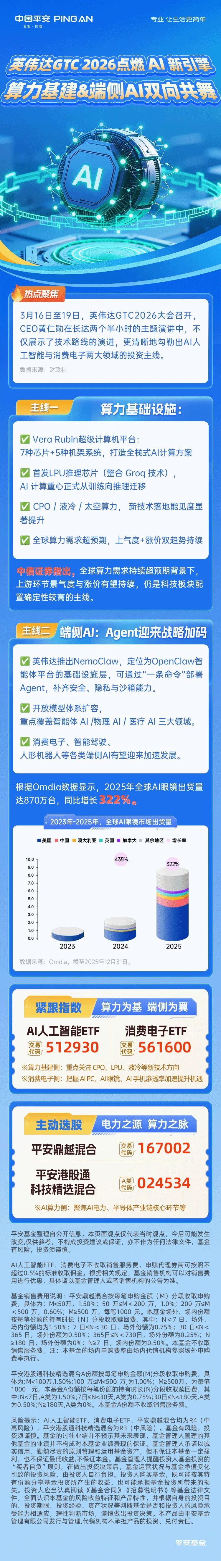 英伟达GTC 2026大会核心观点 - 英伟达GTC 2026大会于3月16日至19日召开,CEO黄仁勋的主题演讲清晰勾勒出人工智能与消费电子两大投资主线 [2] 算力基础设施 - 英伟达推出Vera Rubin超级计算机平台,包含7种芯片和5种机架系统,打造全栈式AI计算方案 [4] - 平台首发整合Groq技术的LPU推理芯片,标志着AI计算重心正式从训练向推理迁移 [4] - CPO(共封装光学)、液冷、太空算力等新技术的落地能见度显著提升 [4] - 全球算力需求超预期,行业呈现景气度提升与涨价的双重趋势 [4] 端侧AI与消费电子 - 英伟达推出NemoClaw,定位为OpenClaw智能体平台的基础设施层,可通过“一条命令”部署Agent,并补齐安全、隐私与沙箱能力 [6] - 英伟达开放模型体系扩容,重点覆盖智能体AI、物理AI、医疗AI三大领域 [6] - 消费电子、智能驾驶、人形机器人等各类端侧AI有望迎来加速发展 [6] - 根据Omdia数据,2025年全球AI眼镜出货量预计达870万台,同比增长322% [6] - 图表显示,全球AI眼镜市场出货量从2023年至2025年增长率显著,其中2025年增长率达322% [7][8] 投资主线与产品关联 - 投资主线概括为“算力为基,端侧为翼” [9] - 算力基建侧建议关注CPO、LPU、液冷等新技术方向 [9] - 消费电子侧建议把握AIPC、AI眼镜、AI手机渗透率加速提升的机遇 [9] - AI算力侧建议聚焦AI电力、半导体产业链核心环节等 [9] - 内容中提及了AI人工智能ETF(512930)、消费电子ETF(561600)、平安鼎越混合(167002)及平安港股通科技精选混合(024534)等金融产品作为相关投资工具 [9]