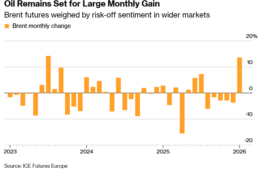 智通财经获悉,由于大宗商品交易员们权衡美国总统唐纳德·特朗普对伊朗与古巴本土不断升级的军事 或政治干预威胁,以及任何潜在的双方敌对行动将如何影响中东与拉美地区的原油以及石油成品供应 流,尤其是交易员们愈发担忧全球原油与天然气海上运输要道——中东霍尔木兹海峡可能因美伊擦枪走 火而陷入紧急封锁,国际原油价格基准——布伦特原油期货价格势将创下自2023年7月份以来最大规模 的月度涨幅。 最新数据显示,布伦特原油在周四自7月以来首次升破每桶70美元关口后,在亚盘初期仍然维持在70美 元上方区域,不过之后不久便跟随铜、黄金以及白银等金属价格而下跌,但跌幅不到1%,在跌破70美 元与略上方徘徊。与此同时,已经下跌多日的美元指数则显著反弹,对大宗商品价格造成重大压制力。 而北美原油定价基准——西德克萨斯中质原油(即WTI原油)期货价格则接近65美元。美国总统特朗普的 最新表态已从因德黑兰对抗议者的致命镇压而计划军事惩罚伊朗,转向本周寻求达成一项新的核协议, 然而双方谈妥的概率仍然非常低。 尽管市场仍然预期2026至2027年全球原油供应增加的同时需求可能将持续萎靡,将对不断国际油价形成 下行压力,但是特朗普政府对伊朗的持续 ...