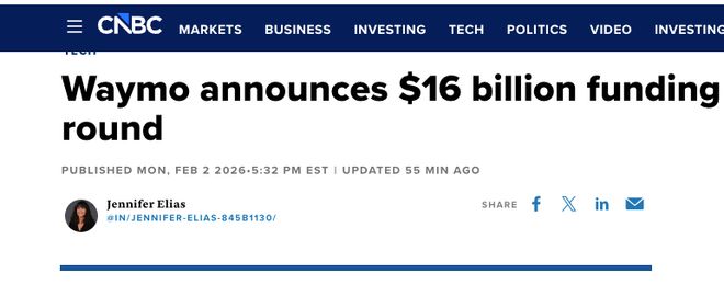 融资与估值 - Waymo完成新一轮总额达160亿美元的融资 公司估值跃升至1260亿美元 较2024年10月上一轮融资时的450亿美元增长近两倍[1] - 本轮融资是Waymo自独立运营以来规模最大的一笔资金注入 此次160亿美元融资后 Waymo估值较上一轮增长180% 较2023年初的约300亿美元翻三倍以上[3] - 2024年10月 Waymo在C轮融资中筹集56亿美元 估值达450亿美元 同时获得Alphabet承诺的50亿美元多年期投资[3] 资金用途与战略 - 新资金将助力公司以“前所未有的速度”发展 同时保持行业领先的安全标准[3] - 公司已从概念验证阶段迈向商业化规模化 为2026年进驻包括东京、伦敦在内的20余座新城市的网约车运营奠定基础[4] - Alphabet通过持续注资 既为Waymo提供了稳定的资金保障 也避免了外部资本干预技术路线 确保其专注于长期目标[3] 业务进展与安全 - Waymo自动驾驶系统Waymo Driver在统计数据上的安全性已优于人类驾驶[3] - Waymo获批开通往返旧金山国际机场的自动驾驶出行服务 其无人驾驶出租车业务已覆盖美国北加州全境 以及洛杉矶、奥斯汀、迈阿密等多个美国核心都市区[4] - 公司不再是验证一个概念 而是将商业落地的模式规模化扩张[4]