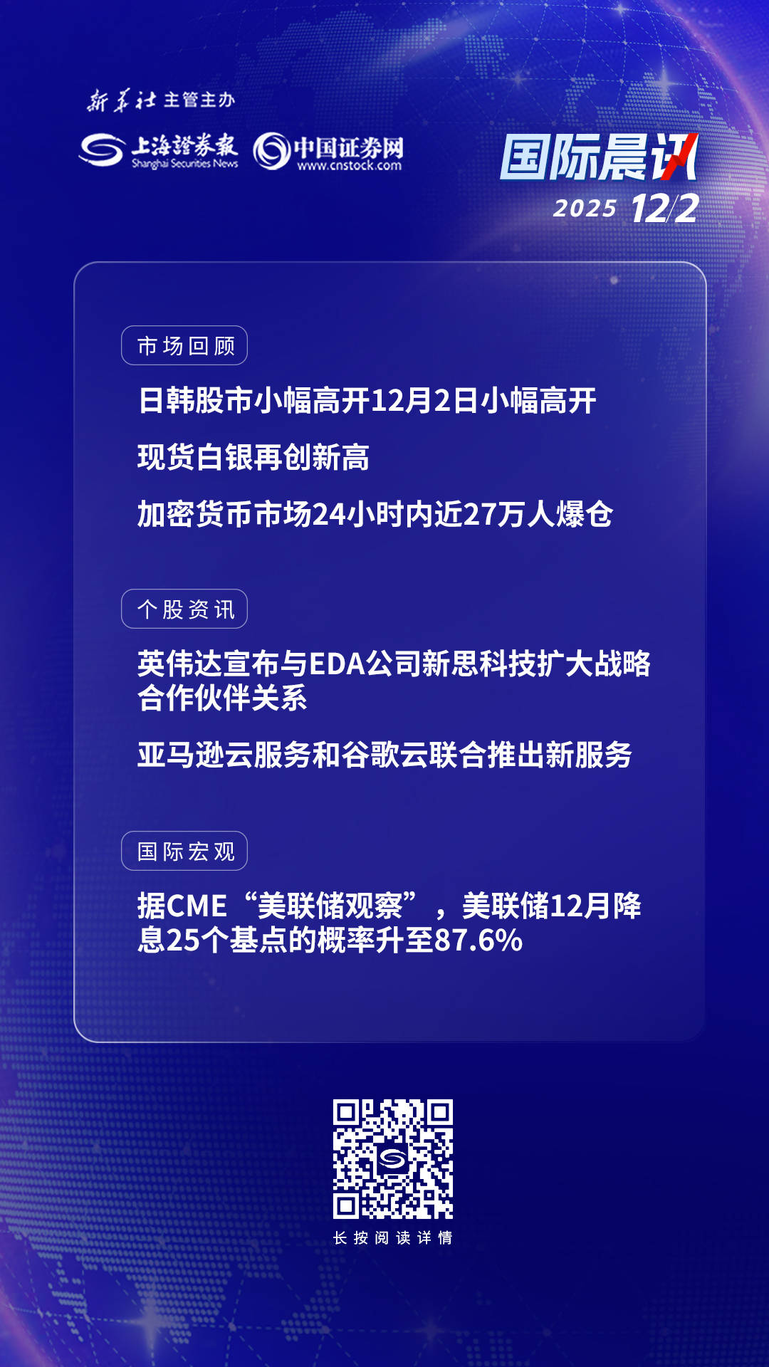 市场回顾 - 日韩股市小幅高开,日经225指数涨0.39%,韩国综合指数涨0.48% [5] - 国际金银价格走强,现货白银再创新高,盘中升破58.8美元/盎司,年内累计涨幅超过100%,伦敦现货黄金最高触及每盎司4264.56美元 [5] - 加密货币市场遭遇抛售,比特币短时跌破84000美元,24小时内近27万人爆仓,爆仓总金额为9.83亿美元 [5] - 美股三大指数结束五连涨,道指跌0.90%,纳指跌0.38%,标普500指数跌0.53% [5] - 纳斯达克中国金龙指数逆势收涨0.87%,热门中概股多数上涨,网易涨5%,阿里巴巴涨超4% [6] 个股资讯 - 英伟达宣布与EDA公司新思科技扩大战略合作,并投资20亿美元购买其普通股,新思科技股价盘前一度涨超11% [7] - 亚马逊云服务和谷歌云联合推出新服务,使客户能在几分钟内于两个云平台间建立高速连接,此前需数周或数月手动设置 [7] - 英伟达发布面向语音、安全和自动驾驶的新型人工智能工具,包括用于自动驾驶的"视觉-语言-行动"AI模型Alpamayo-R1 [7] - 美股加密货币"财库"概念股Strategy收跌3.25%,公司宣布拨出14亿美元储备以支付未来股息和利息,缓解市场担忧 [7] 国际宏观 - 据CME"美联储观察",美联储12月降息25个基点的概率升至87.6% [8] - 美联储到明年1月累计降息25个基点的概率为69.3%,累计降息50个基点的概率为21.3% [8] - 英国央行货币政策制定者梅根·格表示,需待劳动力市场进一步走弱后才会支持再次降息 [8]