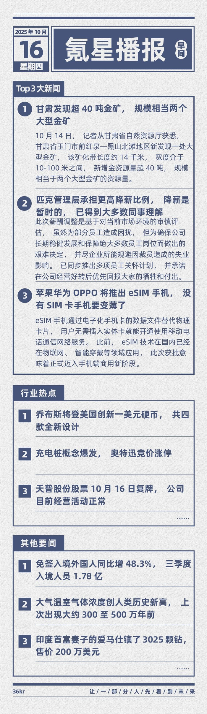 【#氪星播报#|10月16日早间都有哪些#今日大事件#?】 [星星]Top3大新闻 1、#甘肃发现超40吨金矿#,规模相当两个大型金矿 2、#匹克管理层承担更高降薪比例#,降薪是暂时的,已得到大多数同事理解 3、#苹果华为OPPO将推出eSIM手机# ,没有SIM卡手机要变薄了 1、#乔布斯将登美国创新一美元硬币#,共四款全新设计 2、#充电桩概念爆发#,奥特迅竞价涨停 3、#天普股份股票10月16日复牌#,公司目前经营活动正常 4、#李梓萌遭AI仿冒带货#,北京查处首例AI虚假广告案 5、#新款iPadPro发布#,售价8999元起 6、#黄金大牛股大股东宣布减持#,拟减持不超1822万股份 7、#近13万枚比特币被查获#,价值150亿美元 1、#免签入境外国人同比增48.3%#,三季度入境人员1.78亿 2、#大气温室气体浓度创人类历史新高#,上次出现大约300至500万年前 3、#印度首富妻子的爱马仕镶了3025颗钻#,售价200万美元 4、#我国边境缴毒1.35吨#,缴枪支726支 5、#我国首次批量发行盲文版地图#,并推出《触摸故宫珍宝》《触摸》 6、#北京将建高达275米新地标# ,总规划面积20 ...
