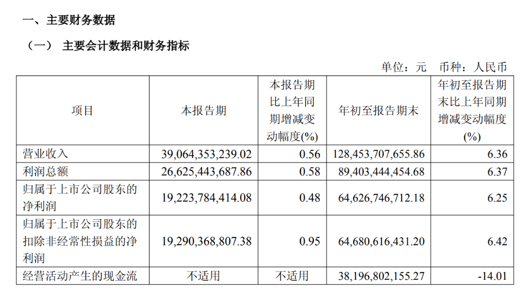 贵州茅台:第三季度净利润192.24亿元,同比增长0.48%,前三季度净利润同比增长6.25%