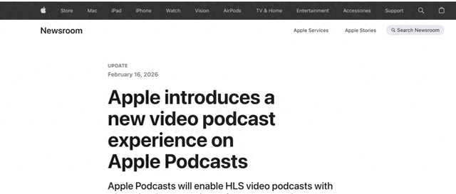 苹果公司产品更新 - 苹果公司宣布将于2026年春季对Apple Podcasts进行重要更新,新增视频播客功能 [1] - 该功能将采用苹果的HTTP Live Streaming (HLS)技术 [1] - 视频播客功能将登陆iPhone、iPad和Apple Vision Pro,用户也可通过网页版Apple Podcasts访问 [4] 用户体验特性 - 用户可在应用中无缝切换音频与视频,支持横屏全屏播放和离线下载 [2] - 视频播放支持基于用户网络环境的自动画质调节 [2] - 视频节目将整合到现有的个性化推荐和编辑推荐栏目中 [2] 创作者与分发生态 - 创作者可通过Acast、ART19、Omny Studio等合作服务商分发HLS视频 [4] - 该功能首次实现动态视频广告插入,为创作者拓展收入机会 [4] - 苹果公司不向创作者或托管方收取分发费用 [4] - 苹果公司计划在2026年晚些时候向参与动态广告的广告网络收取基于展示次数的费用 [4] 技术部署与测试 - HLS视频功能已在iOS 26.4、iPadOS 26.4和visionOS 26.4测试版中开放测试 [4] - 该功能将于2026年春季正式推出 [4]