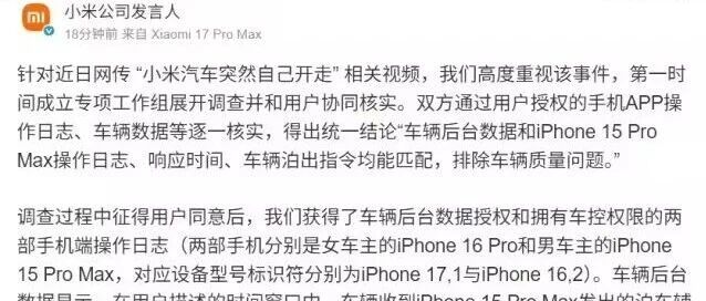 10月3日晚间,"小米公司发言人"微博发文称,针对近日网传 "小米汽车突然自己开走" 相关视频,我们高度重视该事件, 第一时间成立专项工作组展开调查并和用户协同核实。双方通过用户授权的手机APP操作日志、车辆数据等逐一核实,得 出统一结论"车辆后台数据和iPhone 15 Pro Max操作日志、响应时间、车辆泊出指令均能匹配,排除车辆质量问题。" 调查过程中征得用户同意后,我们获得了车辆后台数据授权和拥有车控权限的两部手机端操作日志(两部手机分别是女车 主的iPhone 16 Pro和男车主的iPhone 15 Pro Max,对应设备型号标识符分别为iPhone 17,1与iPhone 16,2)。车辆后台数据显 示,在用户描述的时间窗口中,车辆收到iPhone 15 Pro Max发出的泊车辅助指令,导致车辆激活泊车辅助功能(激活条件 是车辆要在手机蓝牙连接近距离之内),并启动泊出车位。针对用户反馈与线上客服沟通时,称是一台iPhone 16发出泊车 辅助指令。经核实,线上客服在与用户沟通过程中将设备型号标识符(iPhone 16,2)与对应设备型号(iPhone 15 Pro Max)混淆,导致用户错 ...