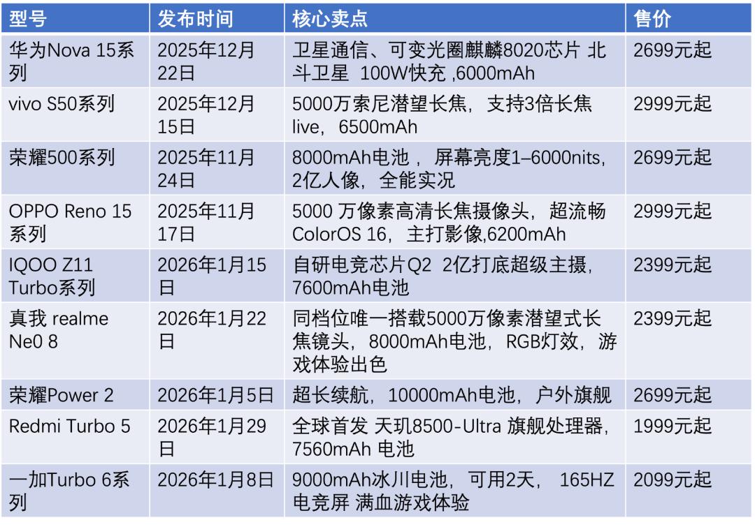 文章核心观点 - 内存芯片价格大幅上涨严重挤压了中端智能手机厂商的利润空间,迫使厂商普遍采取涨价策略,导致中端机传统的“性价比”优势丧失,市场面临高端机型降价下探与低端机型性价比提升的双重挤压,生存空间被严重压缩 [1][8][11][13] - 为应对困境,手机厂商改变了中端机产品定义,从参数堆砌转向体验优先和细分场景极致化,并尝试通过推出“超级标准版”、提供内存补贴等策略维持竞争力,但行业对2026年中端机市场前景普遍悲观 [4][6][15][16] 中端机市场现状与挑战 - 中端机市场份额持续萎缩:从曾占据半壁江山萎缩至不到三成,高盛数据显示其份额自2021年的35%大幅下滑,预计到2027年将降至23% [1][8] - 市场面临双重挤压:高端机型(如iPhone)降价下探和二手市场火热,同时低端机型性价比提升,共同分流了中端用户需求 [8][9] - 厂商发布机型数量与销量占比失衡:2024年中国市场新机型达396款,其中中端机占比超七成,但销量增长主要集中在高端和低端两个极端,中端机销量同比增长仅约4%至7% [8][9] - 经销商利润微薄:3000元价位手机的利润仅约30元,不到高端机的三分之一,导致部分经销商转型做二手市场 [10] 产品策略转变 - 从“水桶机”转向细分场景极致化:厂商不再执着于全能机型,而是在续航、影像、游戏等特定场景将配置拉满 [2][4] - 续航成为关键竞争点:近期发布的9款中端机型电池容量全部在6000mAh以上,荣耀Power 2配备10000mAh,一加Turbo 6和Redmi Turbo 5 Max搭载9000mAh电池 [2] - 体验优先,推动中端配置旗舰化:产品定义发生根本重构,耐用性成为硬指标,并将部分旗舰功能(如卫星通信)下放 [4][6] - 为强化核心体验而削减非必要配置:例如真我Neo8砍掉了前置镜头的4K60帧视频录制功能,以升级游戏体验 [7] 成本压力与厂商应对 - 存储芯片价格暴涨:受AI需求影响,2025年中低端机常用的LPDDR4X年底价比年中涨近80%,中高端使用的LPDDR5X 12GB规格价格从年初约33美元涨至11月超70美元,涨幅超110% [11] - 存储芯片成本占比高:对于中低端机而言,存储芯片直接占据成本的20%-34%,是高端机的一倍还多 [13] - 普遍采取涨价策略应对:近两个月发布的新机型,除荣耀、华为等部分机型外,起售价普遍提高了200-600元不等 [13][14] - 厂商下调订单与尝试新策略:多家手机厂商下调全年整机订单数量,其中小米、OPPO下调超20%,vivo下调近15%,传音下调至7000万台以下 [15] - 尝试推出“超级标准版”与提供补贴:通过配置一步到位支撑产品溢价,例如荣耀500系列全渠道首销日销量达同期系列的151%,Redmi Turbo 5系列则开启10亿内存补贴,512GB版本直降200元并在首销期再降300元 [15] 具体机型发布与销售情况 - 2026年1月安卓厂商密集发布5款中端机型,2025年11月至2026年1月共发布9款中端机型,价格多在2000-4000元区间 [1][2] - 近期部分机型核心卖点与售价:华为Nova 15系列(2699元起,卫星通信)、vivo S50系列(2999元起,潜望长焦)、荣耀500系列(2699元起,8000mAh电池)、OPPO Reno 15系列(2999元起,影像)、iQOO Z11 Turbo系列(2399元起)、真我realme Neo 8(2399元起)、荣耀Power 2(2699元起,10000mAh)、Redmi Turbo 5(1999元起)、一加Turbo 6系列(2099元起,9000mAh电池) [5] - 销售表现:OPPO Reno 15自发售日至1月21日销量为118.75万部,荣耀500系列同期销量为96.12万部 [7] 外部竞争压力 - 高端iPhone挤压市场:iPhone 17系列上市三个月国内销量突破1500万部,其256G版享500元国家补贴后到手价低至5499元 [9] - 二手iPhone市场活跃:2024年苹果二手手机市场份额提升至56%,二手iPhone 13 128G价格甚至不到2000元,极具吸引力 [9] - 上一代旗舰机型价格下探:2500元价位可买到小米15 Pro、华为Pura70 PRO等上一代旗舰机型,进一步削弱新中端机吸引力 [10]