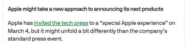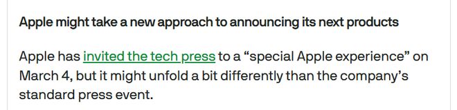 苹果春季产品发布活动安排 - 苹果公司邀请科技媒体参加3月4日的“特殊苹果体验”活动 但活动形式可能与公司标准发布会不同 [1] - 据彭博社报道 苹果计划进行“为期三天的密集发布”而非在单一主题演讲中宣布所有内容 最终于3月4日在纽约、伦敦和上海三地举行“体验”活动 媒体将有机会亲身体验即将推出的产品 [2] - 据推测 该“体验”活动可能是一个提供现场演示的动手体验环节 [2] 预计发布的新产品 - 据报道 苹果在此期间将宣布至少五款新产品 包括一款低成本MacBook [2] - 其他可能发布的产品包括:iPhone 17e、搭载M4芯片的iPad Air、新款入门级iPad、升级版MacBook Air以及新款MacBook Pro机型 [2] - 所有提及的产品预计都将在今年春季推出 但具体哪些产品在何时宣布尚不确定 [2]