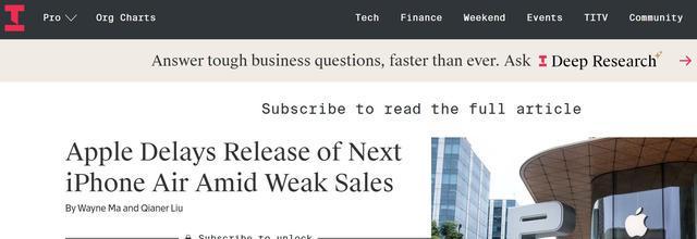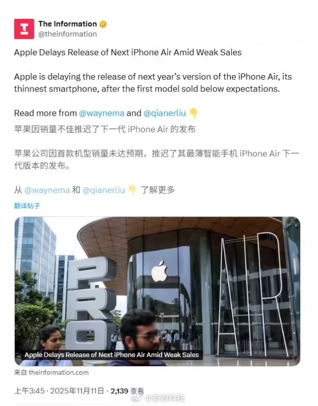 销量疲软引发战略调整:苹果大幅推迟iPhone Air 2发布计划