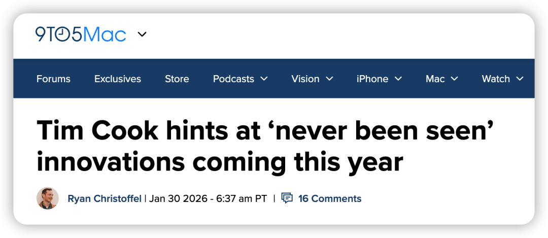 公司财务表现 - 当季营收为1438亿美元,同比增长16%,创下公司历史最高季度营收 [1] 公司战略与展望 - 公司表示当季度意义非凡,并将在未来一年内带来“前所未见”的创新,持续丰富用户生活 [1] - 公司展望未来几周和几个月,预计将推出“最佳作品” [1] - 近些年公司明显调整了保密政策,尤其在重大新品发布前,包括高管在内不会完全“守口如瓶” [2] 产品发布规划 - 公司预计将在今年发布超过20款硬件新品,涉及多个品类 [2] - 其中iPad、Mac和Apple Watch预计以常规升级为主 [2] - 传闻中可被称为“前所未见”的产品包括折叠屏iPhone和苹果智能眼镜 [2] - 结合过往高管言论模式,外界预测所谓的“最佳作品”很可能就是折叠屏iPhone [2] 折叠屏iPhone产品细节 - 产品可能命名为iPhone Ultra,采用内折设计 [2] - 配备7.8英寸外屏以及5.5英寸内屏 [2] - 完全折叠状态下机身厚度为9mm,比iPhone 17 Pro Max的8.75mm略厚 [2] - 预计将搭载采用台积电全新2nm工艺的A20 Pro芯片 [4] - A20 Pro芯片相比A19性能提升15%,能效提升30% [4] - 有望参考OPPO Find N5的内部设计,其核心铰链及精密部件已被采纳 [4] - 有望配备5500mAh左右的电池容量,可能是史上电池容量最大的iPhone [4] - 最快将在今年9月发布 [4]