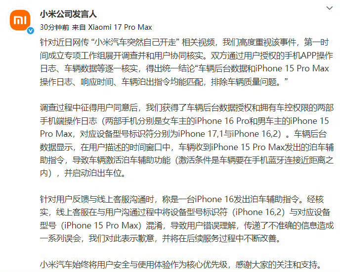 "小米公司发言人"微博10月3日晚通报: 调查过程中征得用户同意后,我们获得了车辆后台数据授权和拥有车控权限的两部手机端操作日志(两部手机分别是女车主的iPhone16Pro和男车主的 iPhone15Pro Max,对应设备型号标识符分别为iPhone17,1与iPhone16,2)。车辆后台数据显示,在用户描述的时间窗口中,车辆收到iPhone15Pro Max发出的 泊车辅助指令,导致车辆激活泊车辅助功能(激活条件是车辆要在手机蓝牙连接近距离之内),并启动泊出车位。 针对用户反馈与线上客服沟通时,称是一台iPhone16发出泊车辅助指令。经核实,线上客服在与用户沟通过程中将设备型号标识符(iPhone16,2)与对应设备 型号(iPhone15Pro Max)混淆,导致用户错误理解,传递了不准确的信息造成一系列误会,我们对此表示歉意,并将在后续服务过程中不断改善。 针对近日网传"小米汽车突然自己开走"相关视频,我们高度重视该事件,第一时间成立专项工作组展开调查并和用户协同核实。双方通过用户授权的手机 APP操作日志、车辆数据等逐一核实,得出统一结论"车辆后台数据和iPhone15Pro Max操作日志、 ...