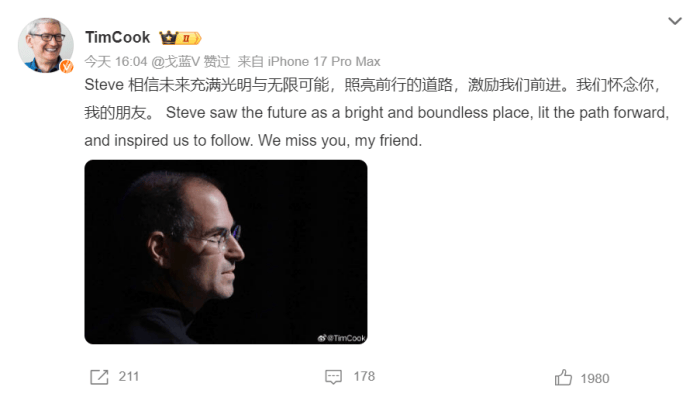 库克发文悼念乔布斯逝世十四周年:照亮前行道路,激励我们前进