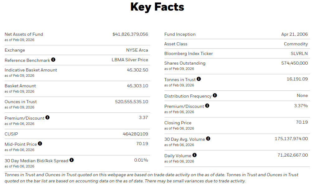 基金概况 - 基金净资产管理规模为428.92亿美元[2] - 基金在纽约证券交易所Arca板块交易[2] - 基金参考基准为伦敦金银市场协会白银价格[2] - 基金CUSIP代码为46428Q109[2] 信托资产与份额详情 - 截至2026年2月10日,信托持有白银45,302.70吨[2] - 截至2026年2月10日,信托持有白银521,370,990.90盎司[2] - 截至2026年2月10日,基金指示性篮子规模为45,302.00份[2] - 截至2026年2月10日,基金已发行份额数量为45,302.00份[2] 交易与定价数据 - 截至2026年2月9日,基金收盘价为76.00美元[2] - 截至2026年2月9日,基金盘中价中点为76.00美元[2] - 截至2026年2月9日,基金溢价/折价率为4.43[2] - 截至2026年2月9日,基金30日平均买卖价差中值为0.01%[2]