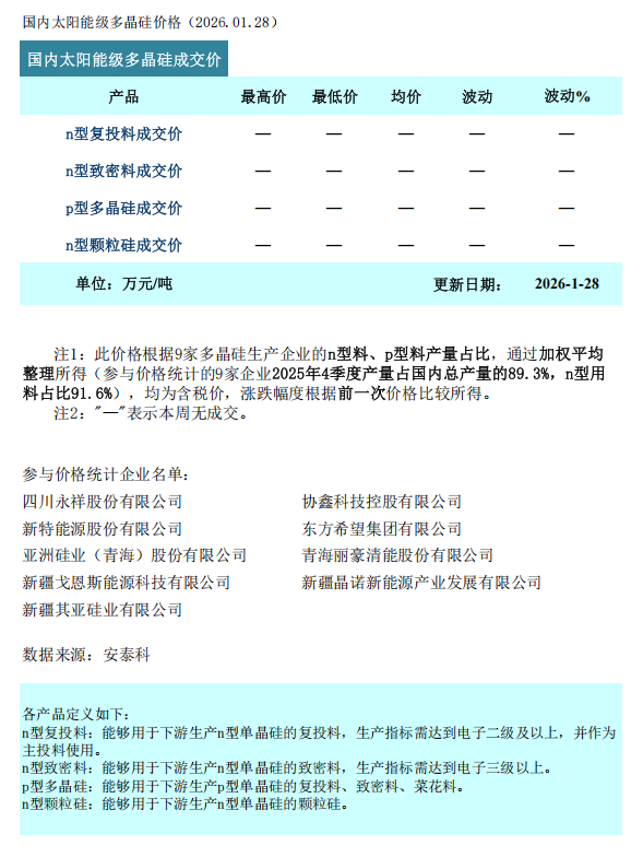 多晶硅市场现状 - 本周多晶硅主流产品均无规模性成交 仅极个别企业达成小额试探性订单 新单签约量近乎停滞 [1] - 尽管部分企业为试探市场下调报价 但下游采购意愿持续低迷 以消化库存和僵持观望为主 未因报价松动而启动补库 导致调价难以转化为实际成交 [1] 供需格局分析 - **需求侧制约因素**:银浆等关键辅材价格持续高位导致电池片生产成本居高不下 叠加组件端海外订单放量不足 采购意愿低迷 同时春节临近加剧了硅片、电池企业开工计划的不确定性 进一步抑制短期需求 [1] - **供应侧收缩情况**:头部企业大幅减产或停产导致硅料供应持续收缩 一家头部企业已全面停产 叠加另外两家企业减产落地 [1] - **供需弱平衡**:预计1月份多晶硅产量环比大幅减少15% 与同期硅片企业的排产规模基本匹配 市场累库速度显著放缓 供需弱平衡格局进一步巩固 [1] - **未来供应计划**:从排产计划看 2月份多晶硅产量将进一步下调至8.2-8.5万吨 供应收缩力度持续加大 [1] 后市展望 - 春节临近叠加一季度传统淡季 国内终端需求与海外组件订单均缺乏强劲支撑 同时银浆等辅材高价也导致电池片成本压力难减 [2] - 供应端头部企业主动执行停产、减产计划 推动供应收缩 对价格形成一定支撑 但行业高位库存仍未有效消化 对价格上行的压制作用依旧持续 [2] - 综合来看 在供应收缩、需求疲软、高位库存等因素相互制衡的格局下 预计短期内多晶硅价格将维持窄幅平稳运行态势 [2] 价格数据与统计说明 - 截至2026年1月28日 国内太阳能级多晶硅各产品(n型复投料、n型致密料、p型多晶硅、n型颗粒硅)本周均无成交 价格表显示为“一” [3] - 价格数据根据9家多晶硅生产企业的n型料、p型料产量占比加权平均整理所得 参与统计的9家企业2025年4季度产量占国内总产量的89.3% n型用料占比91.6% [3] - 参与价格统计的企业包括四川永祥、协鑫科技、新特能源、东方希望、亚洲硅业等九家公司 [4]