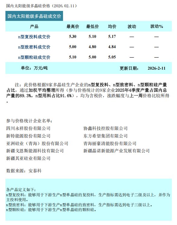 多晶硅市场价格与成交情况 - 本周n型复投料成交均价为5.17万元/吨,价格区间为5.1-5.3万元/吨 [1] - 本周n型颗粒硅成交均价为5.05万元/吨,价格区间为5.0-5.1万元/吨 [1] - n型致密料成交均价为4.84万元/吨,价格区间为5.00-4.80万元/吨 [2] 市场成交活跃度与结构 - 本周市场活跃度略有回升,打破前期完全停滞局面,共有4家企业达成少量订单 [1] - 整体成交仍以试探性交易为主,但成交结构呈现分化,颗粒硅成交量显著高于棒状硅 [1] - 少量订单的达成在一定程度上为后续价格构筑了底部支撑 [1] 当前市场供需状态与价格博弈 - 下游终端需求尚未好转,加之临近春节假期,上下游观望情绪浓厚,节前大规模采购意愿低迷 [1] - 当前硅料企业多处于大幅减产甚至停产状态,进一步大幅下调报价的意愿较弱 [1] - 短期内,多晶硅市场仍将处于僵持观望态势,主导因素是节前需求疲软与供应收缩之间的博弈,价格波动空间有限 [1] 产品性价比与需求驱动因素 - 颗粒硅因具备相对较高的性价比,更易达成刚需订单的实质性成交 [1] - 节后,随着终端装机项目逐步启动,下游需求有望自下而上传导,带动采购需求放量 [1] - 硅料供应的持续收缩也将对供需关系的改善形成支撑 [1] 价格数据来源与样本代表性 - 价格数据根据9家多晶硅生产企业的产量占比通过加权平均整理所得 [2] - 参与统计的9家企业2025年4季度产量占国内总产量的89.3%,其n型用料占比为91.6% [2] - 数据来源为安泰科,更新日期为2026年2月11日 [2] 市场核心矛盾与未来展望 - 供需核心矛盾的化解,重点依赖于终端需求的全面复苏以及相关能耗政策的有效落地 [1]